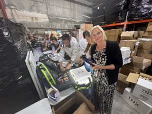 Die Vorsitzende von Christen an der Seite Israels in Österreich bereitete gemeinsam mit anderen Teilnehmern Notfallrucksäcke für ZAKA-Rettungshelfer vor. Foto: C4I